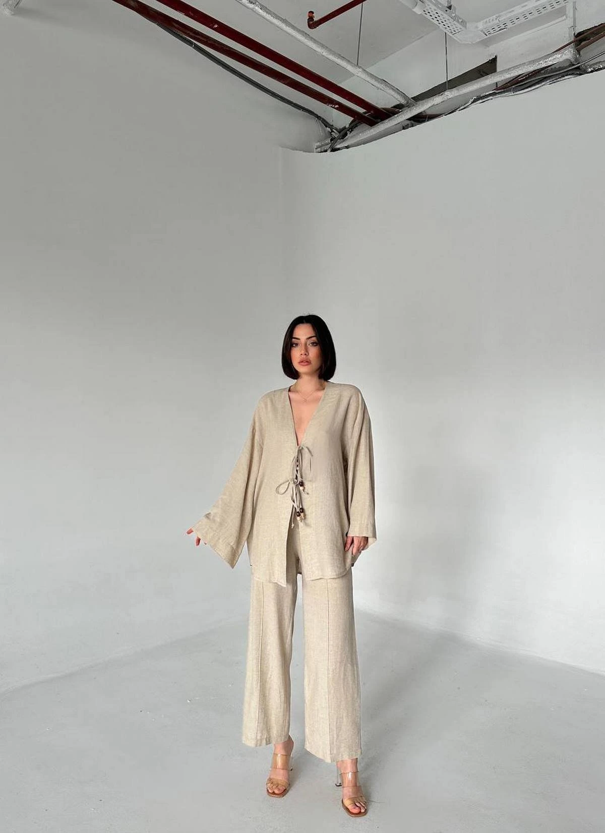 BAĞCIKLI KİMONO ASTARLI PANTOLON PAMUK TAKIM – NATUREL