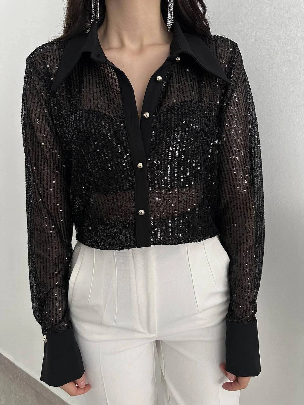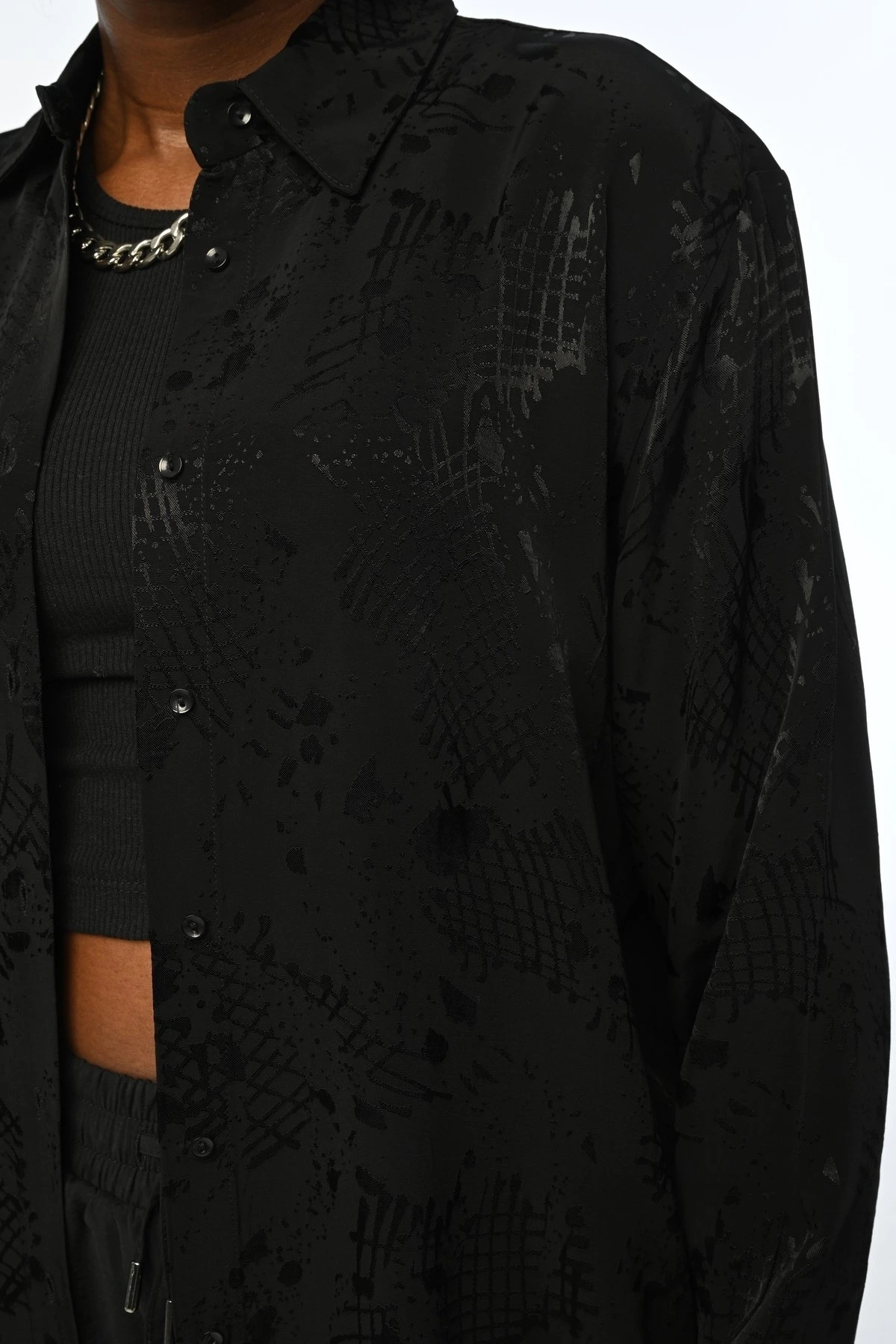 ORGANZE SIRT ETİKETLİ CROP GÖMLEK – SİYAH