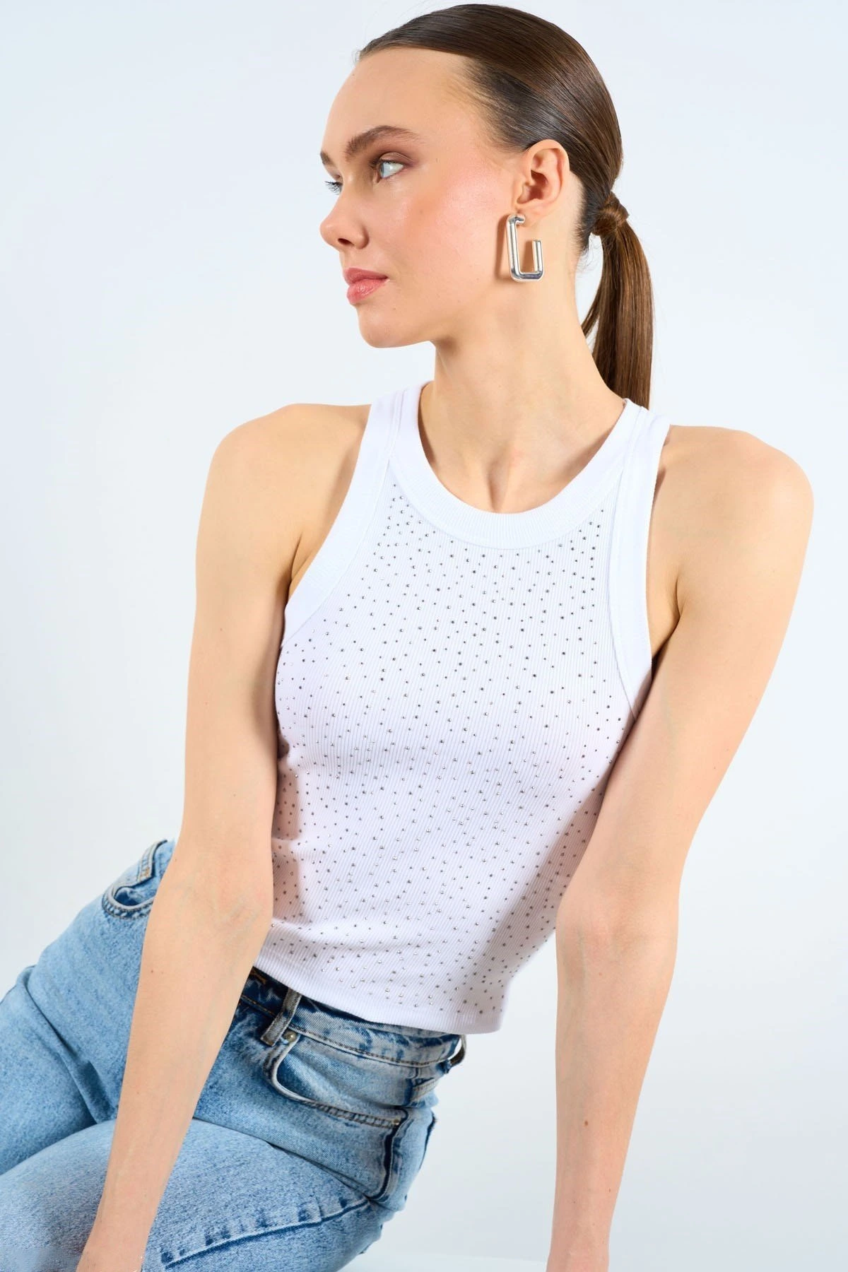 YAKA SIRA TAŞ PAMUK TİŞÖRT – BEYAZ