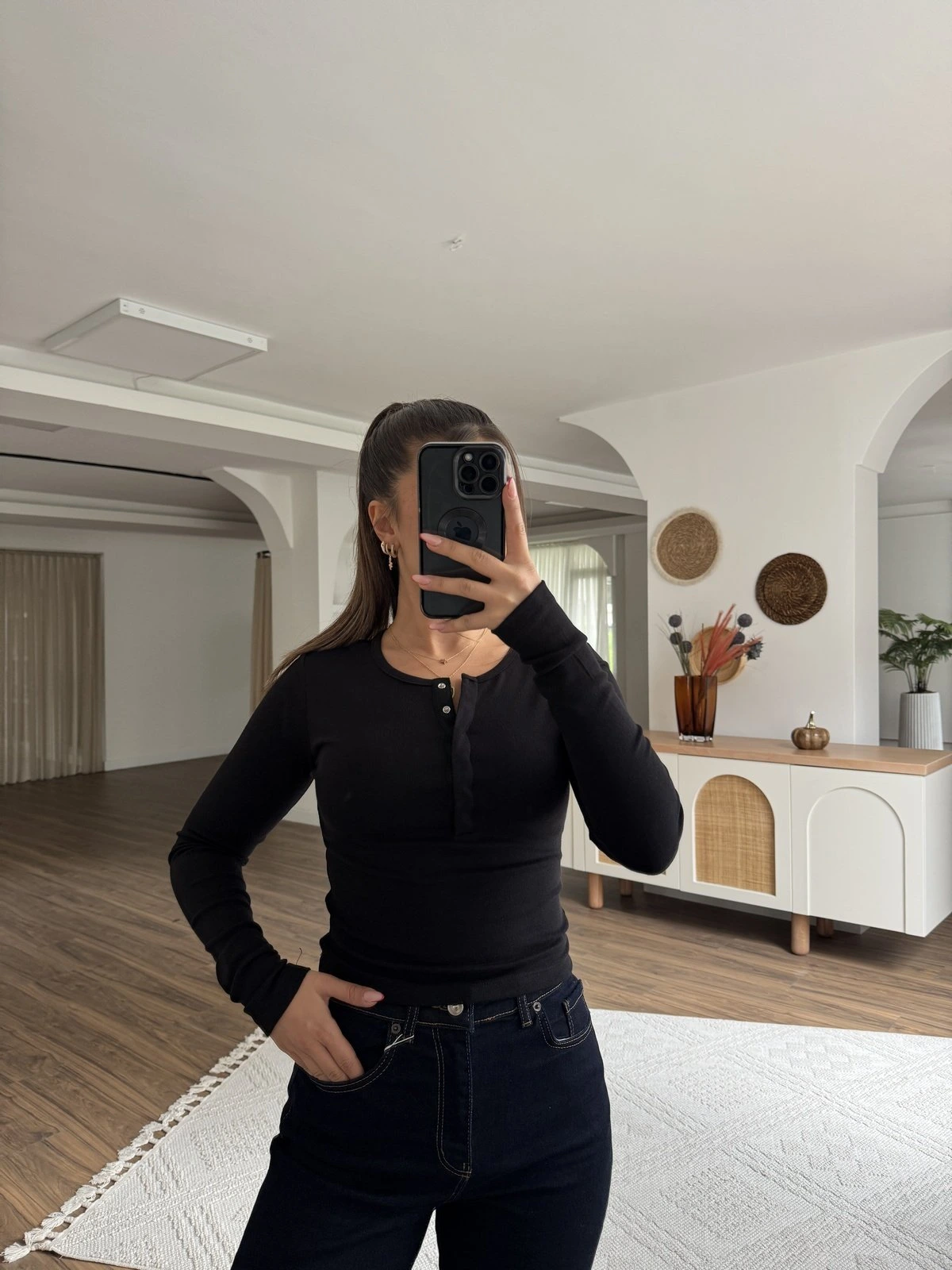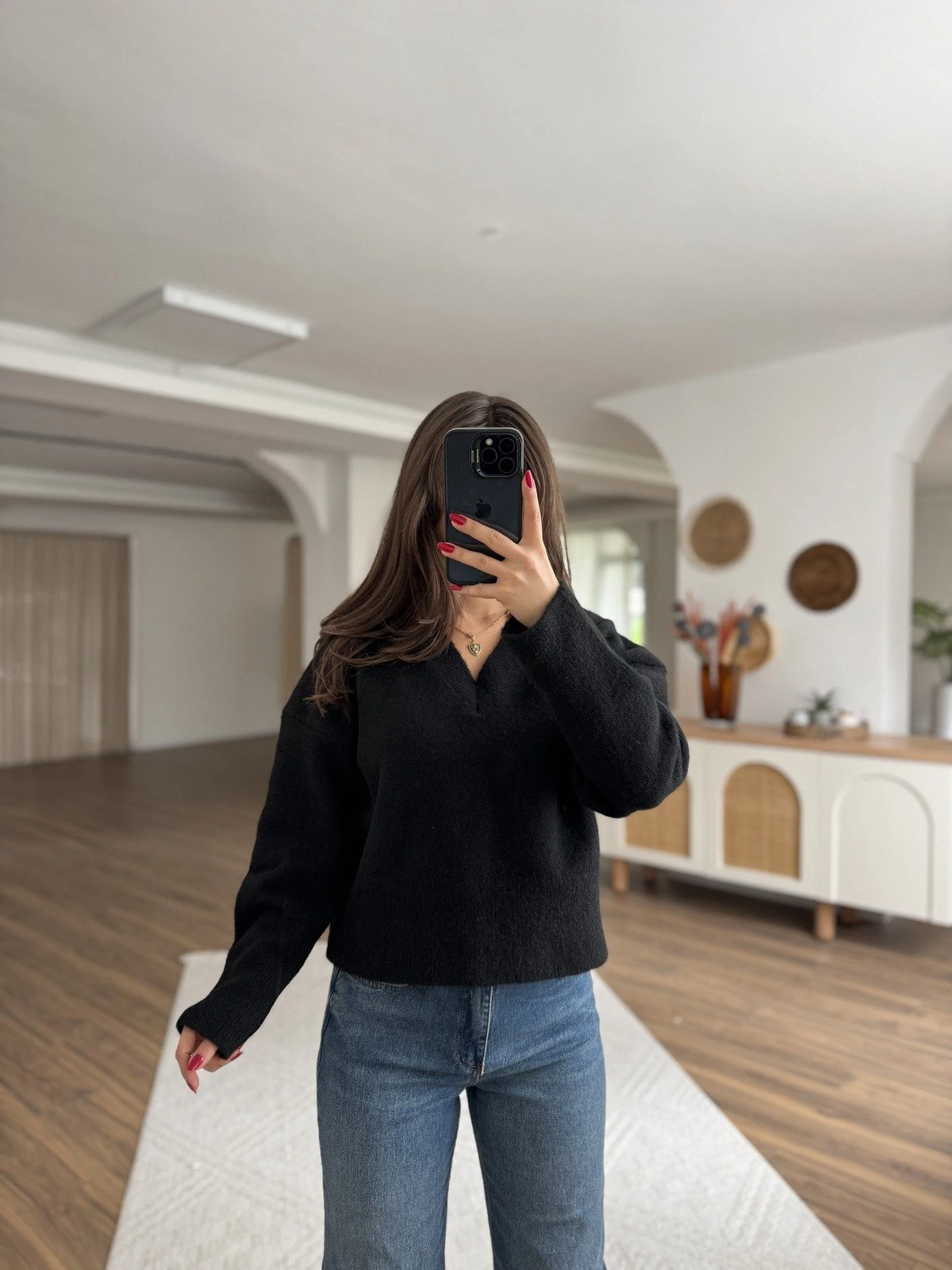 V YAKA YUMUŞAK DOKU YÜN KARIŞIMLI DÜŞÜK OMUZ KAZAK – SİYAH