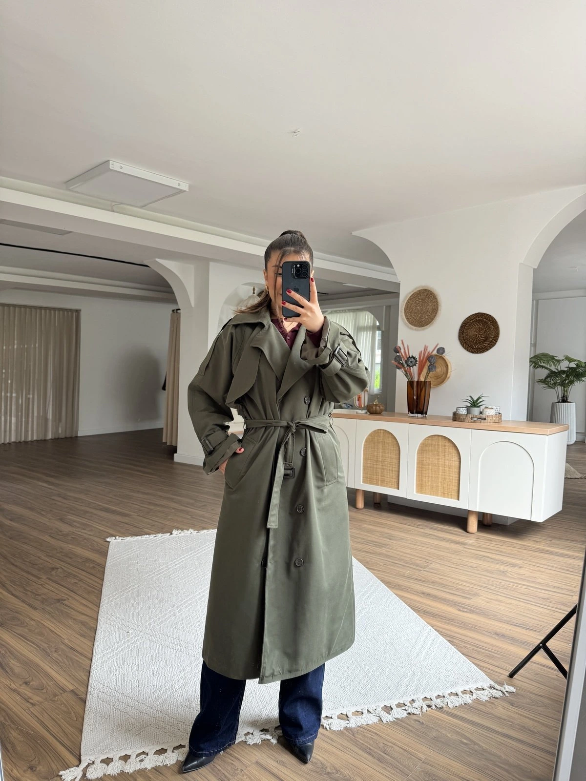 KAPÜŞONLU BEL BÜZGÜ CEP DETAY VİSKON KISA TRENÇ – HAKİ