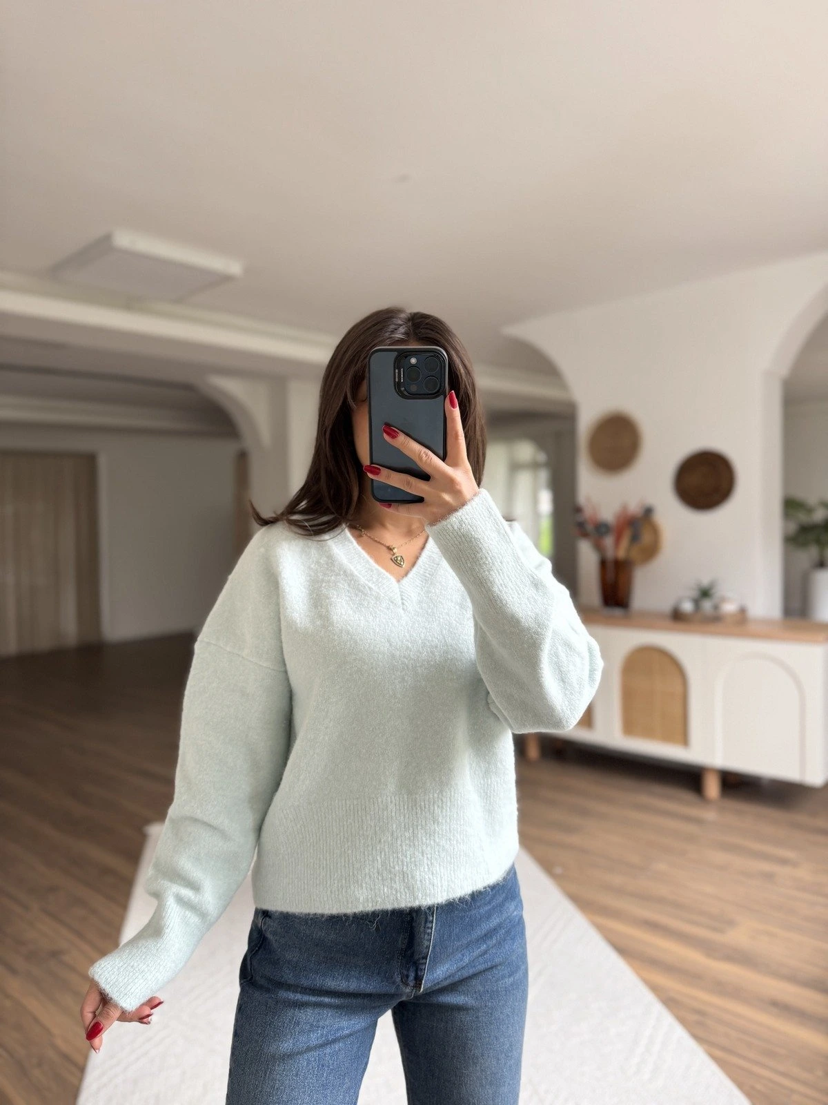 V YAKA YUMUŞAK DOKU YÜN KARIŞIMLI DÜŞÜK OMUZ KAZAK – AÇIK MİNT