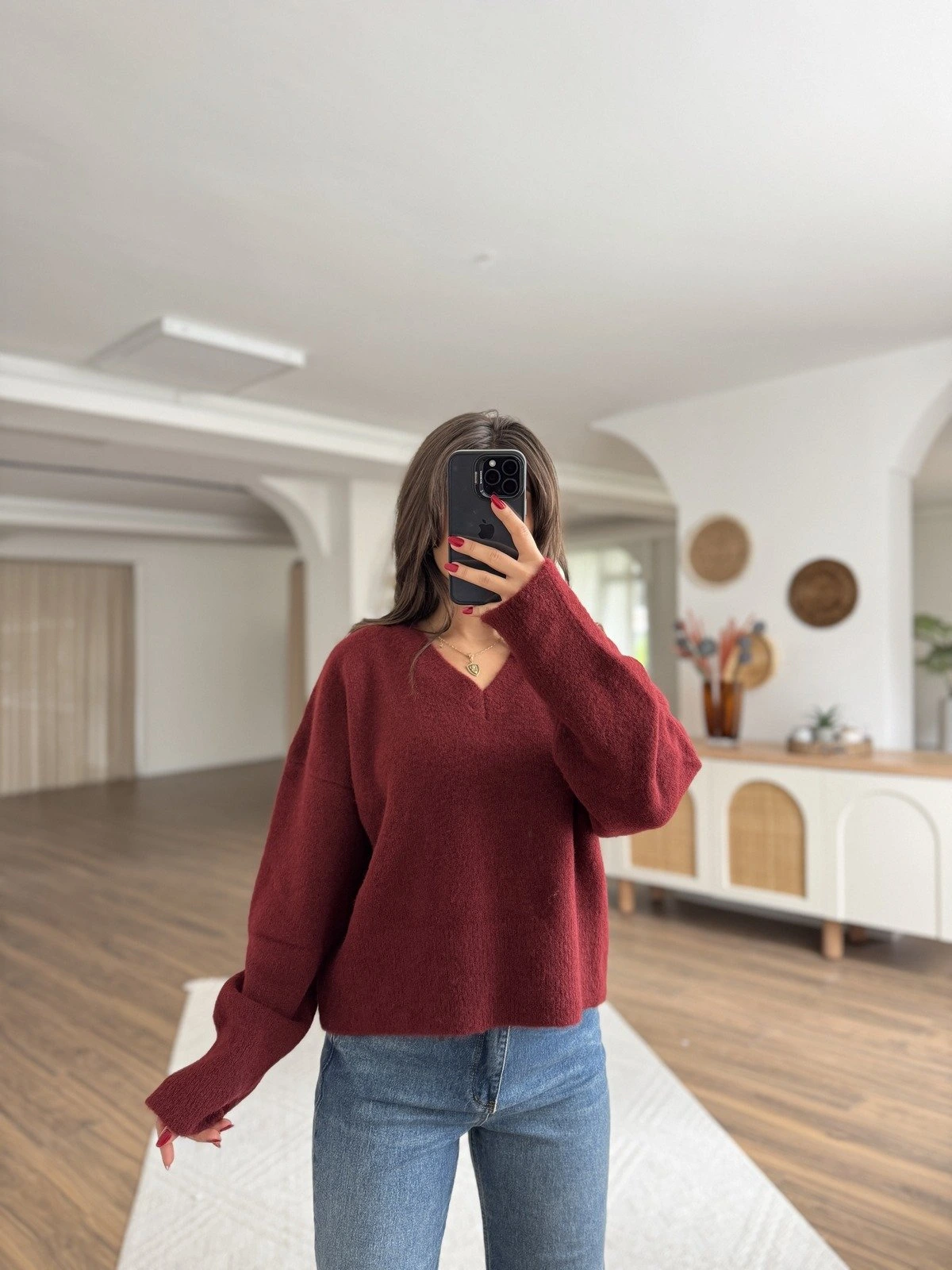 V YAKA YUMUŞAK DOKU YÜN KARIŞIMLI DÜŞÜK OMUZ KAZAK – BORDO