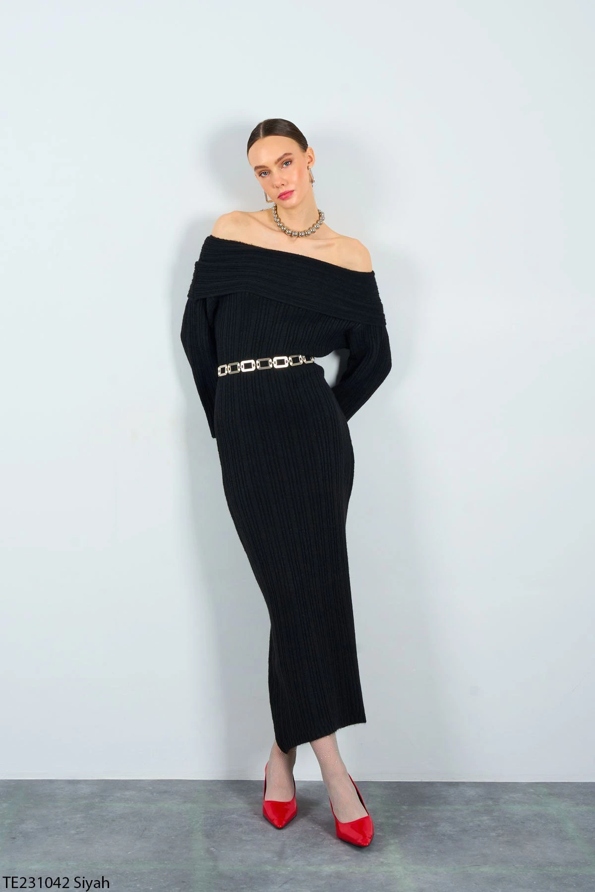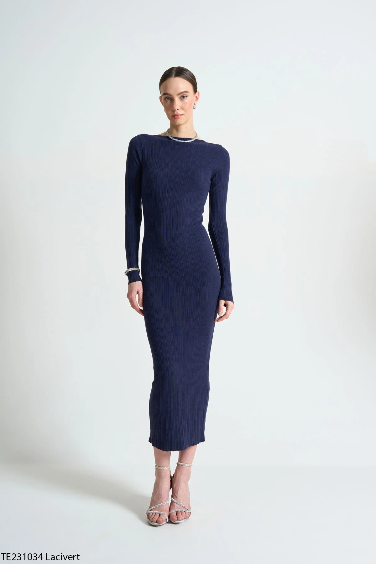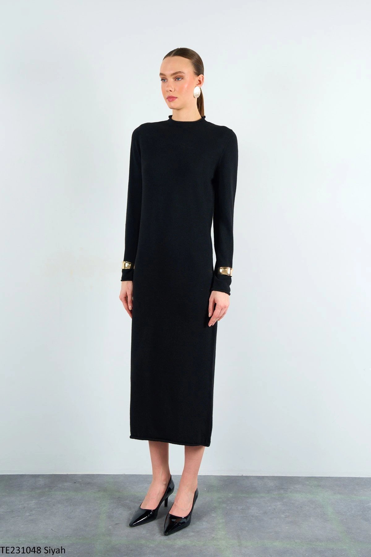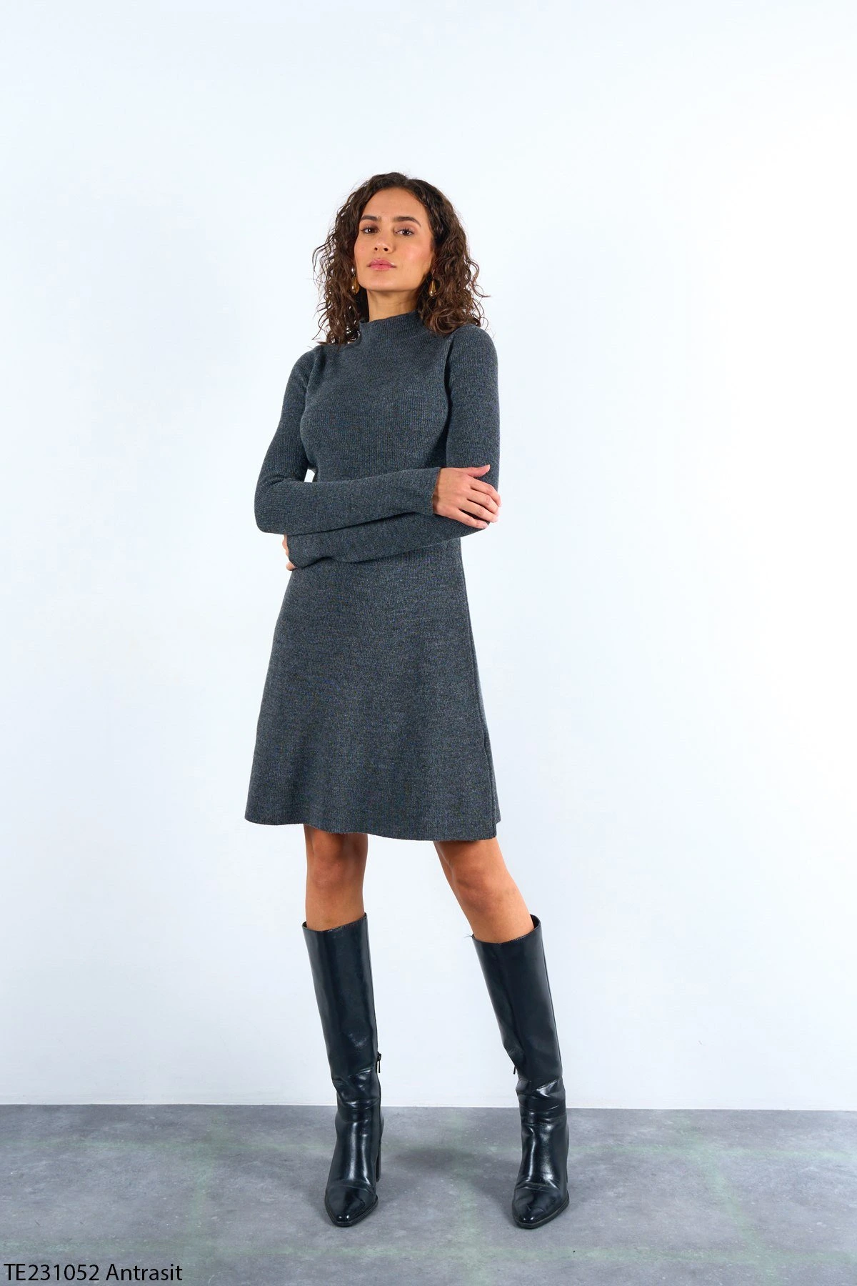 DİK YAKA REGLANLI TRİKO ELBİSE – FÜME