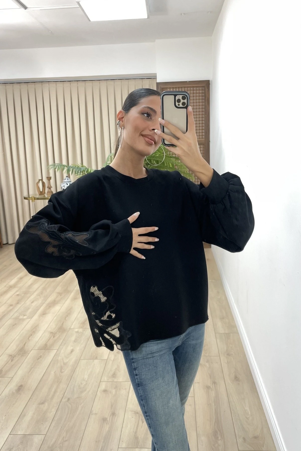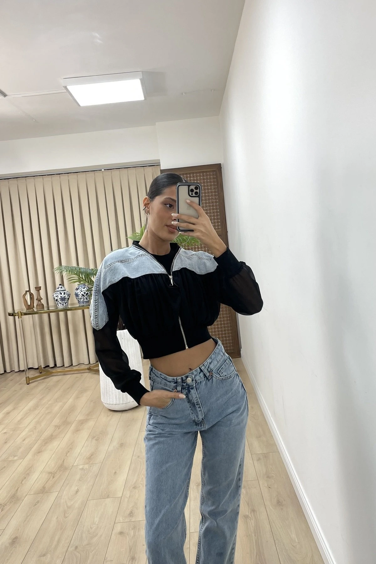 KOL YAZI DETAY TASARIM CROP CEKET – SİYAH