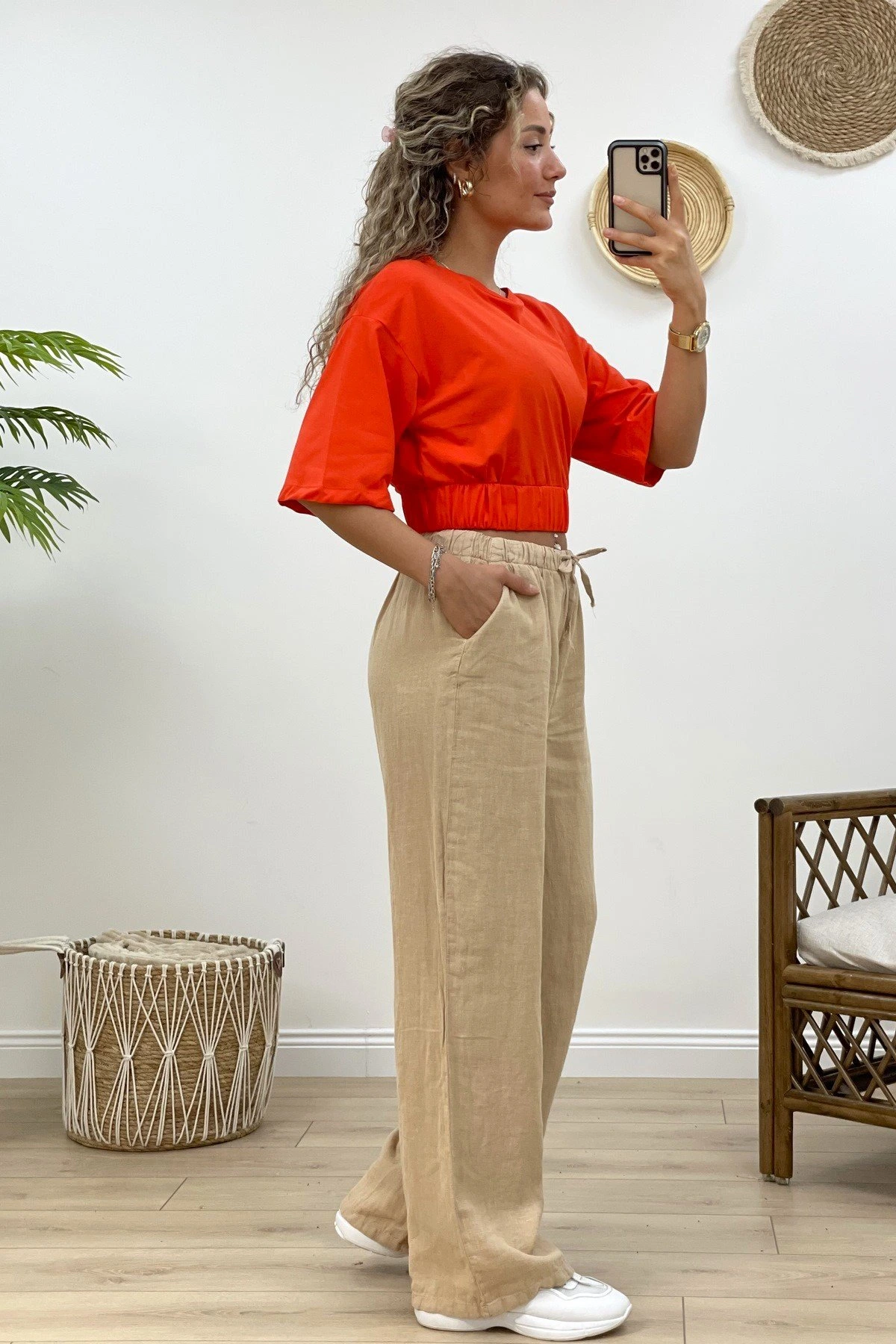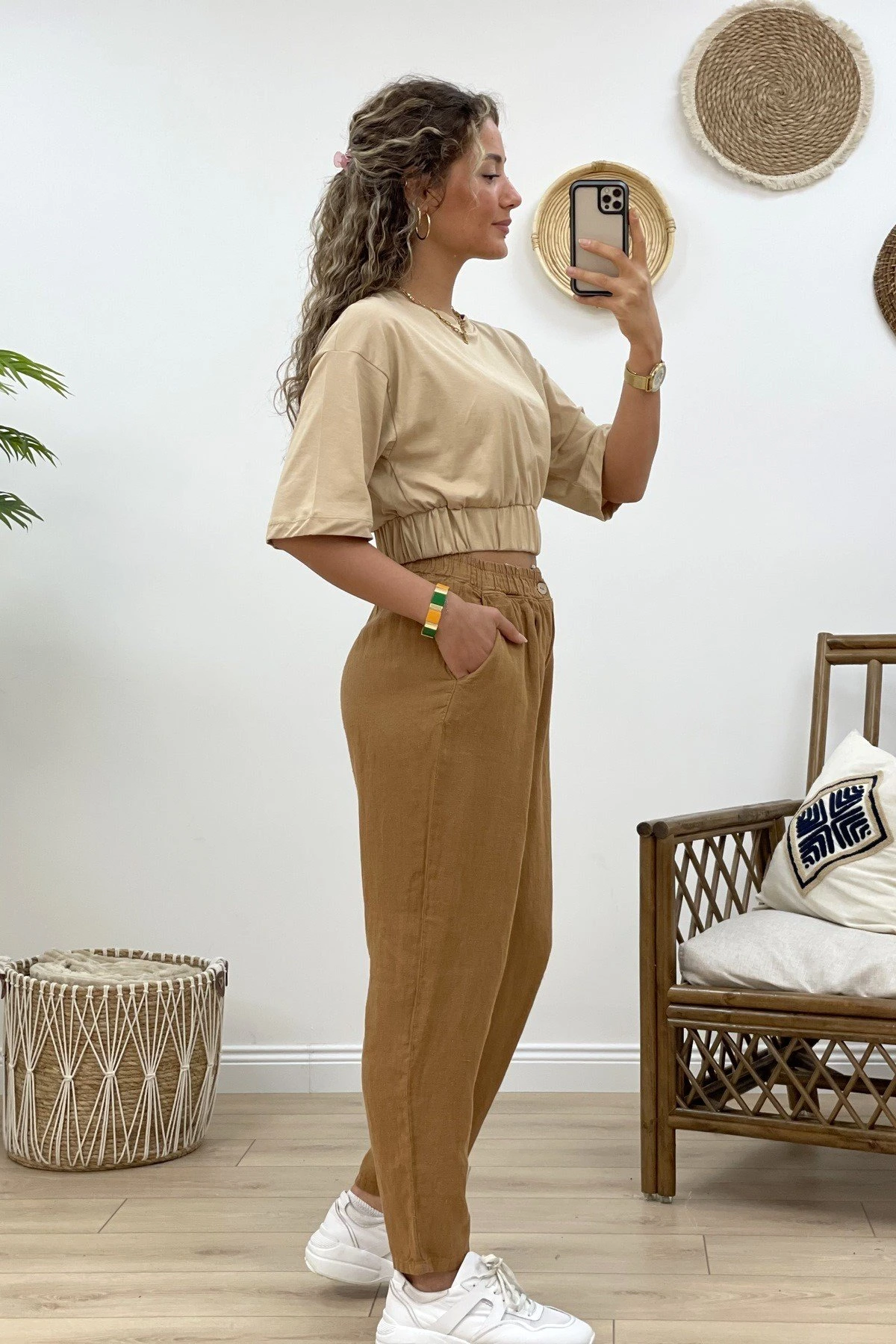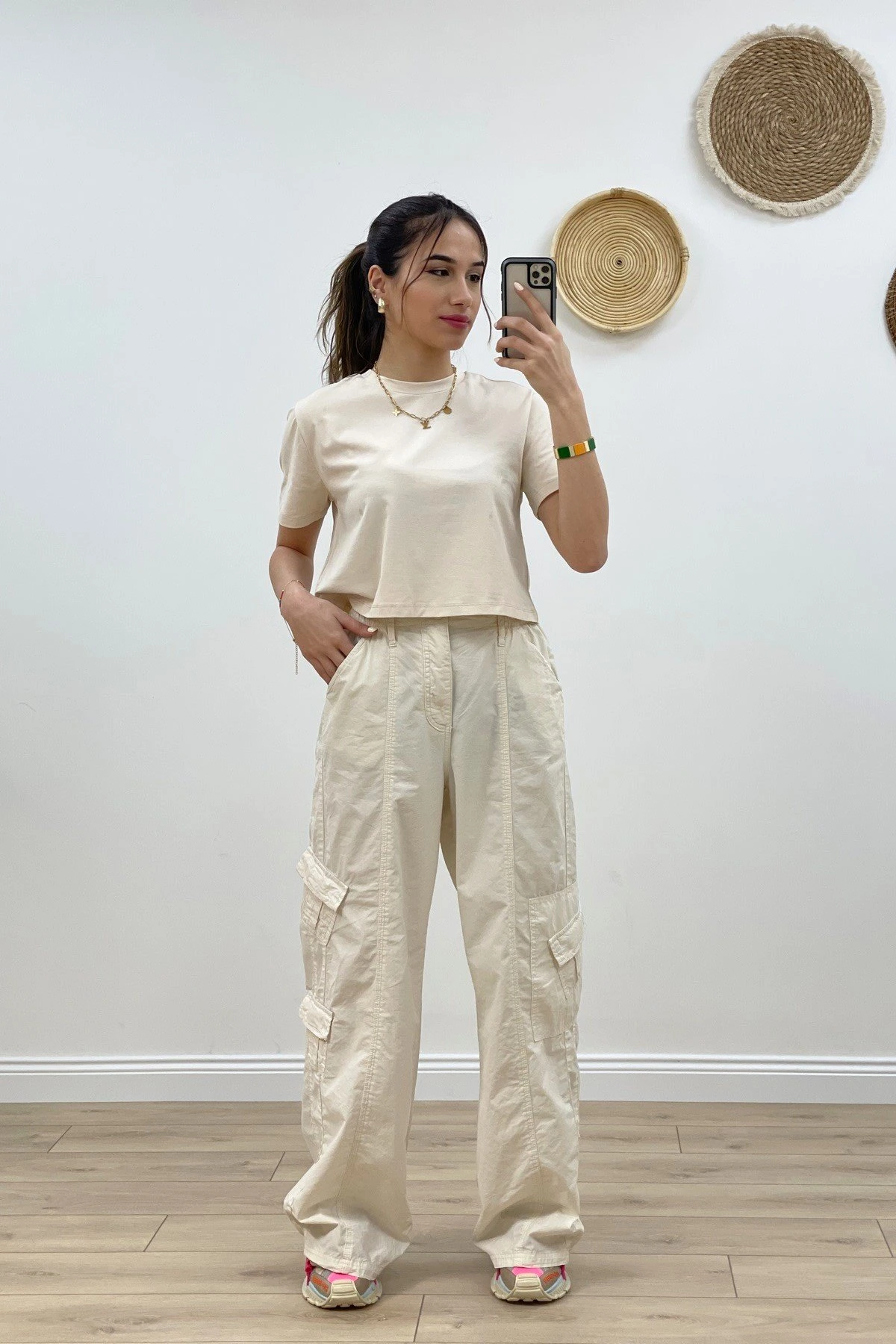 BEL KALIN LASTİK CROP TİŞÖRT – BEJ