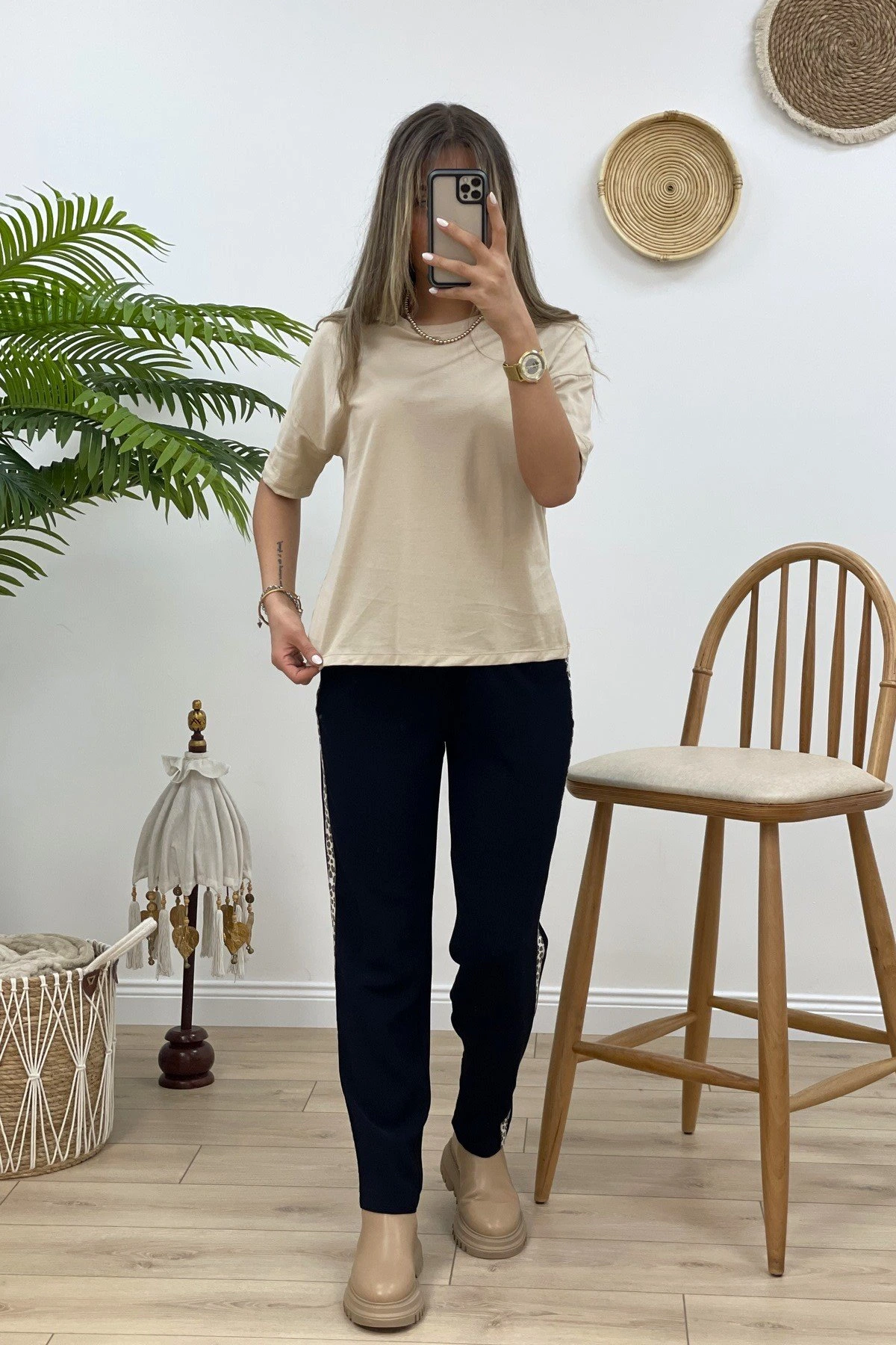 LEOPAR ŞERİT DETAYLI HAVUÇ MODEL PANTOLON – LACİVERT