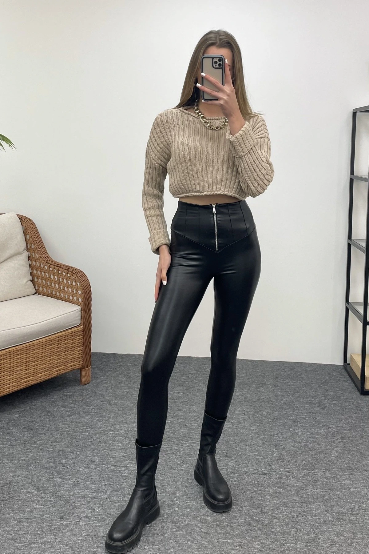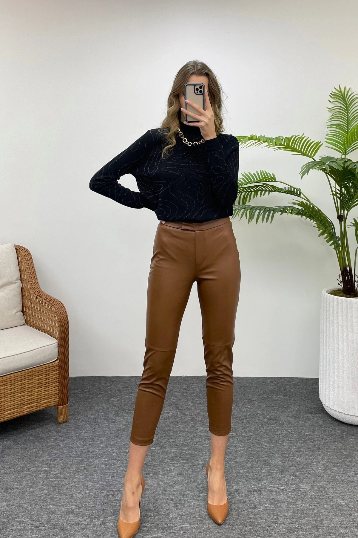 DİZ DİKİŞİ DETAY DERİ PANTOLON – SÜTLÜ KAHVE