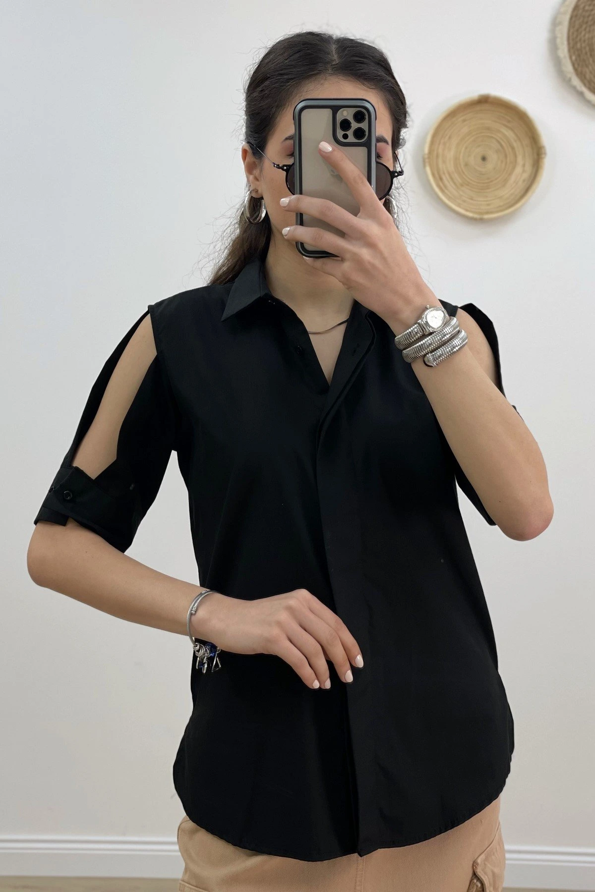 LİKRALI KOL DEKOLTELİ KISA KOL GÖMLEK – SİYAH